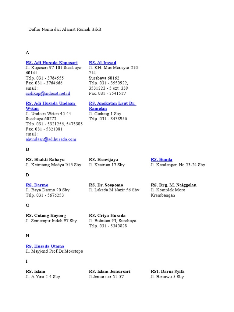 Daftar Nama dan Alamat Rumah Sakit. 2021 Dinas Kesehatan Kota Surabaya. 031 - 3764555 Fax.